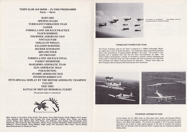 From the early 1960’s the Tiger Club pilots were always encouraged in display flying and Tiger Club shows were put on at various airfields in England, the highlight of the season was always the Redhill show. ![]() The Club airshow at Redhill always made the most of the home grown talent and they were very popular with the crowds. The 1973 show included the famous Czech pilot Ladislav Bezak who in 1971 escaped from behind the Iron Curtain with his wife and four children all in a Zlin 226 and flew to Germany. ![]() The shows continued until the late 1980’s and the format remained very similar. By 1983 the show included the aircraft detailed in this page from the show programme. ![]() The cover for each years programme produced some excellent photographs of the Club aircraft and the cost of putting on a show steadily increased which is shown in the increased entry and programme costs. Jeanne Frazer organised the shows throughout the 1980's. The cover for 1986 which was one of the last shows the Club has put on. The 1986 show gave details of many of the best loved acts, such as the Stampe Duo which was started by Pete Jarvis and Carl Schofield, Brian Smith and others joined in later years. ![]() The 1986 Airshow had several Club pilots who were flying other aircraft including Keith Sissons then flying the B-17 Sally B. Some of the pilots of the various warbirds were also Club pilots, some of whom had started display flying in the Turbulent Team. The Unipart Aerobatic Team were flying RF-4’s to Pink Floyd's music and both pilots were Club members. This display act was started with John Taylor and Brendan O'Brien, in later years Mike Dentith and Matthew Hill took over. |