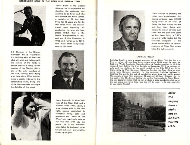 From the early 1960’s the Tiger Club pilots were always encouraged in display flying and Tiger Club shows were put on at various airfields in England, the highlight of the season was always the Redhill show. ![]() The Club airshow at Redhill always made the most of the home grown talent and they were very popular with the crowds. The 1973 show included the famous Czech pilot Ladislav Bezak who in 1971 escaped from behind the Iron Curtain with his wife and four children all in a Zlin 226 and flew to Germany. ![]() The shows continued until the late 1980’s and the format remained very similar. By 1983 the show included the aircraft detailed in this page from the show programme. ![]() The cover for each years programme produced some excellent photographs of the Club aircraft and the cost of putting on a show steadily increased which is shown in the increased entry and programme costs. Jeanne Frazer organised the shows throughout the 1980's. The cover for 1986 which was one of the last shows the Club has put on. The 1986 show gave details of many of the best loved acts, such as the Stampe Duo which was started by Pete Jarvis and Carl Schofield, Brian Smith and others joined in later years. ![]() The 1986 Airshow had several Club pilots who were flying other aircraft including Keith Sissons then flying the B-17 Sally B. Some of the pilots of the various warbirds were also Club pilots, some of whom had started display flying in the Turbulent Team. The Unipart Aerobatic Team were flying RF-4’s to Pink Floyd's music and both pilots were Club members. This display act was started with John Taylor and Brendan O'Brien, in later years Mike Dentith and Matthew Hill took over. |