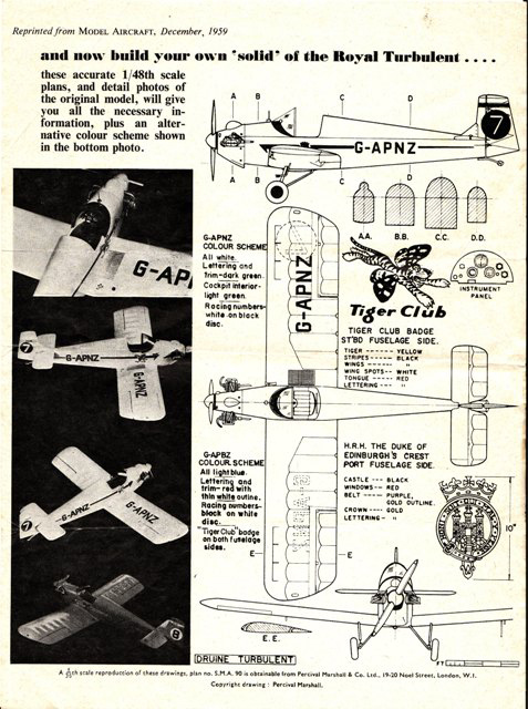 In 1959 The Duke of Edinburgh flew G-APNZ at White Waltham and soon after a radio control model was designed and the details were published in The Model Aircraft magazine to commemorate this event. G-APNZ was one of the first Rollason Turbulents to be built and the other picture shows it earlier in 1959 when it was being built. It took 4 men, six weeks to build a Turbulent under the supervision of Jimmy James, the hangar foreman at Rollasons.